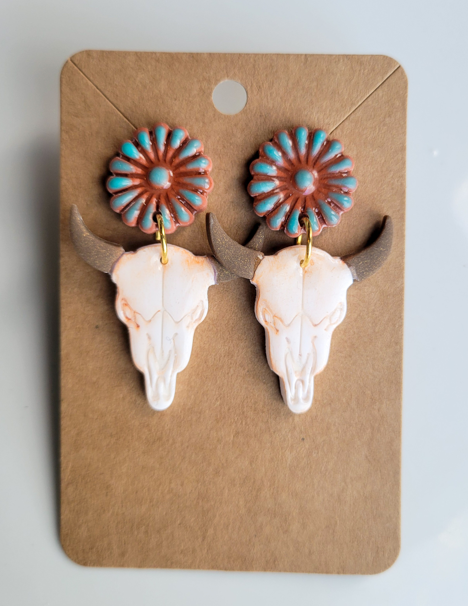Dare to be different with these bull skull earrings that pack personality in every pair. Crafted with southwestern flair, they feature warm rust tones swirled with striking turquoise accents that'll have everyone asking where you found them. Lightweight and unapologetically bold, these boho beauties are made for rebels, dreamers, and anyone who refuses to blend in. Your ears deserve this kind of fun.